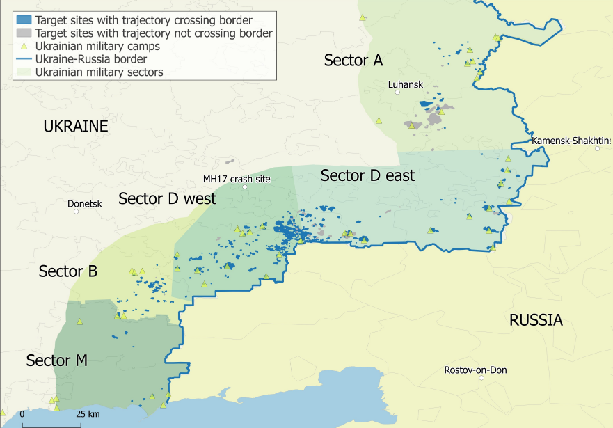 Расследователи изучили всю приграничную территорию в зоне конфликта на предмет наличия потенциальных огневых позиций и мест артиллерийских обстрелов и обнаружили сотни мест, имеющих отношение к предмету исследования.