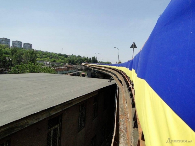 В Одесском морском торговом порту развернули самый длинный украинский флаг в истории страны. Длина растянутого на автомобильной эстакаде полотнища составила один километр.