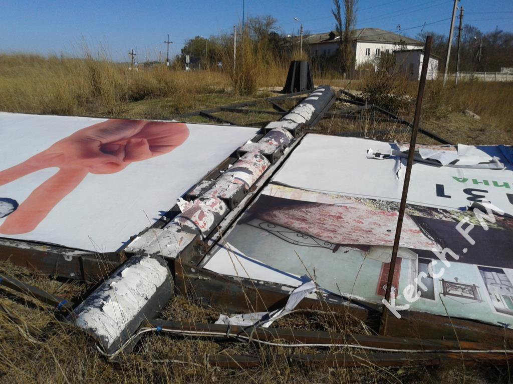 Еще вчера вечером щит по напором сильного ветра был как парус — постепенно наклонялся, пишет Керчь.ФМ.