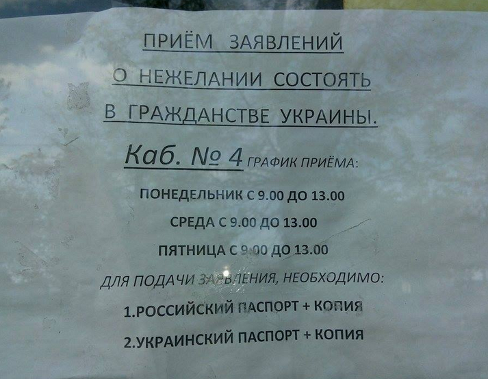 Федеральная миграционная служба в Крыму принимают заявления от местных жителей о нежелании состоять в гражданстве Украины. Соответствующие объявления развешаны на входах в управления ФМС по Крыму. Об этом сообщает мобильная группа правозащитников в Крыму.