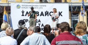 На Софийской площади в Киеве 28 августа около сотни человек пришли почтить память погибших под Иловайском бойцов в 2014 году. Среди участников акции — родные и близкие погибших.