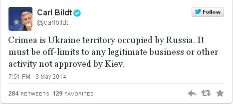 Бизнес должен работать в оккупированном Крыму только с согласия украинской власти. Об этом в своем Twitter написал глава МИД Швеции Карл Бильдт.