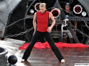Со временем все наладили, и шоу продолжилось. Кульминацией должен был стать танец Анастасии Волочковой, которая старалась вписалась в команду рокеров. Но ее выступление не обошлось без накладок.