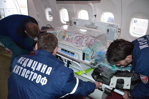 Самолет Ан-148, осуществляющий транспортировку детей, двое из которых новорожденные, оснащен высокотехнологичными медицинскими модулями и специальным оборудованием, которое позволяет поддерживать нормальное функционирование организма и при необходимости оказывать помощь тяжелобольным во время полета.