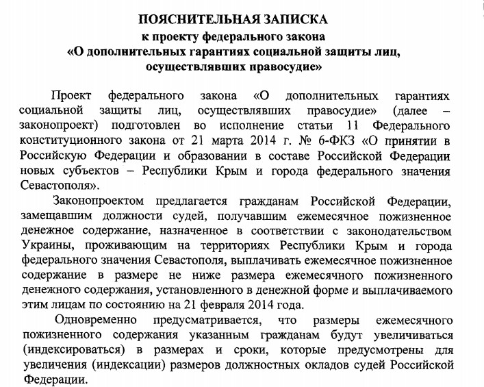 Документом, предлагается установить 82-ум судьям-пенсионерам ежемесячное пожизненное содержание не ниже того, которое они получали по украинскому законодательству по состоянию на 21 февраля 2014 года. При этом регламентируется возможность индексации выплаты в соответствии с законодательством РФ, если сумма украинского пособия окажется меньше. Для выплаты этого пособия в 2015 году из федерального бюджета планируется выделить 93,3 млн рублей.