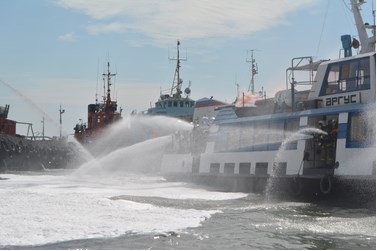 По легенде учений на теплоходе «Аргус», по пути следования к месту стоянки произошло короткое замыкание электропроводки в машинном отделении, в следствии чего произошло возгорание. Организовать тушение пожара с помощью первичных средств пожаротушения экипажу судна не удается из-за высокой задымленности и температуры.