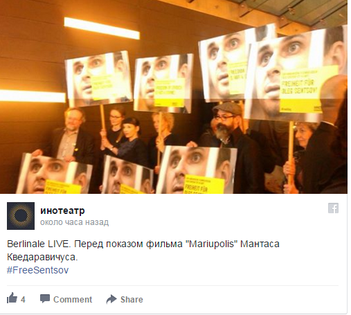 Перед показом фильма «Mariupolis» Мантаса Кведаравичуса в рамках 66-го Берлинского международного кинофестиваля прошла акция в поддержку крымского политзаключенного, режиссера Олега Сенцова.