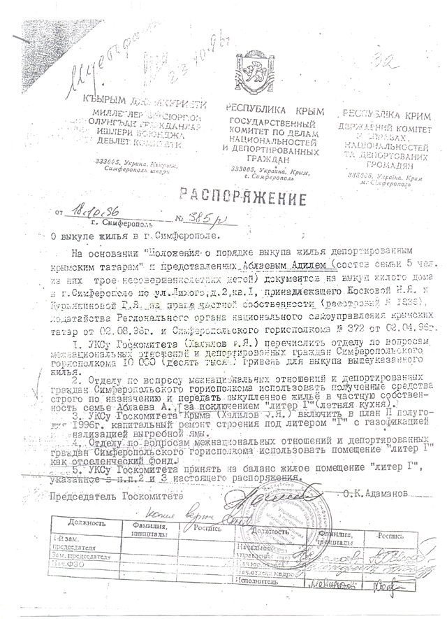 Квартира, к которой прилегает летняя кухня (литер «Г» согласно техпаспорту БТИ), была выкуплена Республиканским комитетом по делам межнациональных отношений и депортированных граждан для А.Р.Аблаева в 1997 году. А летнюю кухню передали на баланс горисполкома, который определил ее как отселенческий фонд и закрепил за Камуржиевой до тех пор, пока не подойдет ее очередь на получение постоянного жилья.