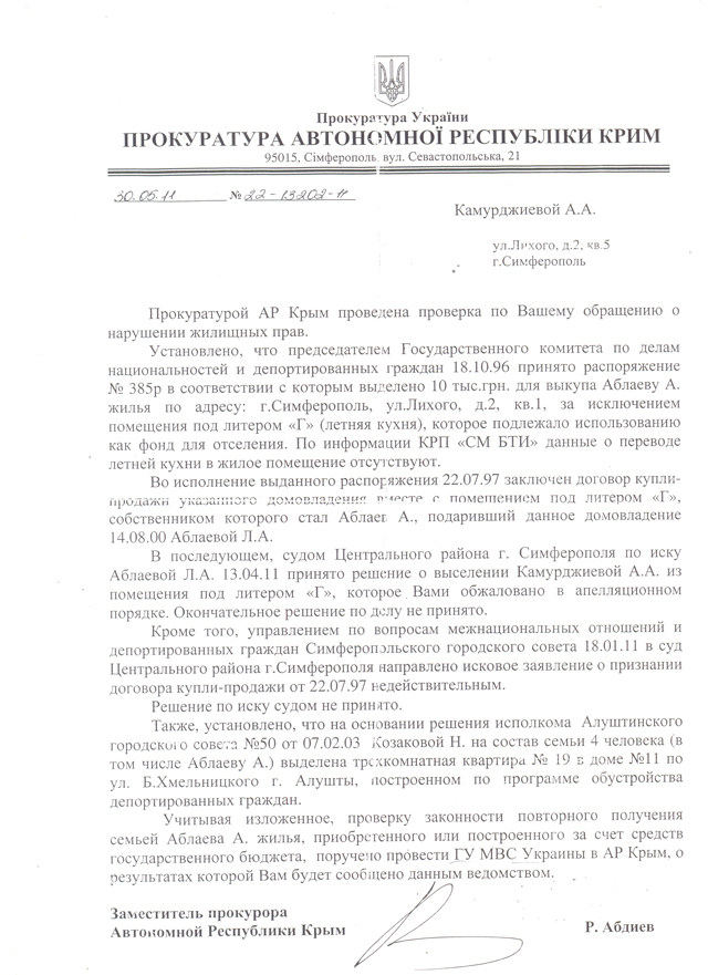 В ответе Прокуратуры указано, что Главным управлением МВД Украины в АР Крым проводится проверка законности повторного получения семьей Аблаева жилья, приобретенного или построенного за счет государственных средств.