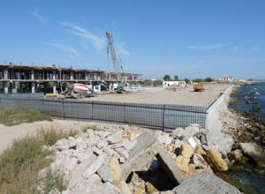 В Евпатории в нарушение закона о запрете на строительство в 100-метровой прибрежной зоне активно ведется строительство многоэтажного сооружения. Здание возводится на укрепленной площадке не более чем в 50 метрах от моря на Симферопольском шоссе.