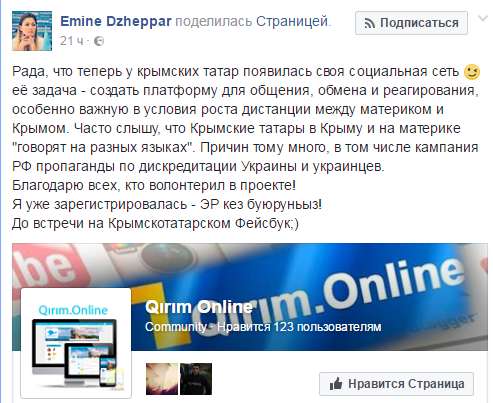 Джепарова сообщила, что сама она уже зарегистрировалась на «крымскотатарском Фейсбук».