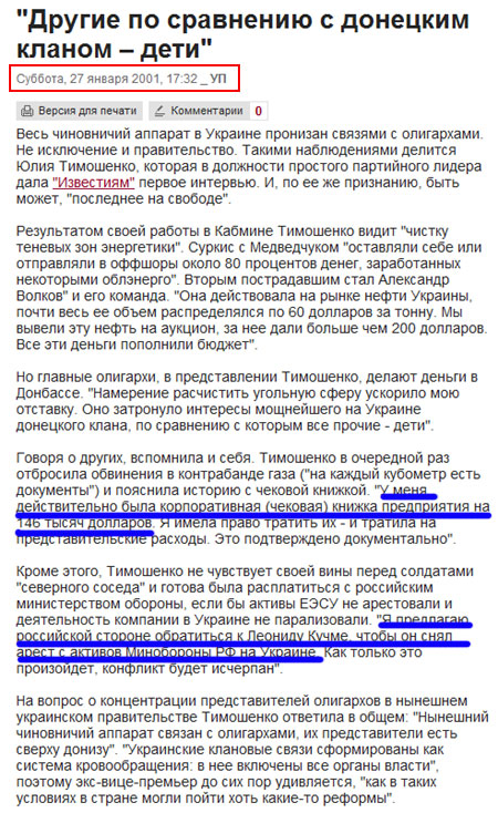 Однако, как выяснила “Украинская правда”, под видом нового интервью Тимошенко из СИЗО “Известия” опубликовали интервью Тимошенко 2001 года, в котором она комментирует дело ЕЭСУ.