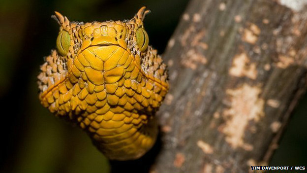 В отдаленном районе Танзании, на востоке Африки, обнаружили новый вид змеи с яркой окраской. Черно-желтая змея длиной 60 см имеет над глазами роговидные чешуи. Об открытии нового вида, который назвали рогатая гадюка Матильды, написал журнал Zootaxa.