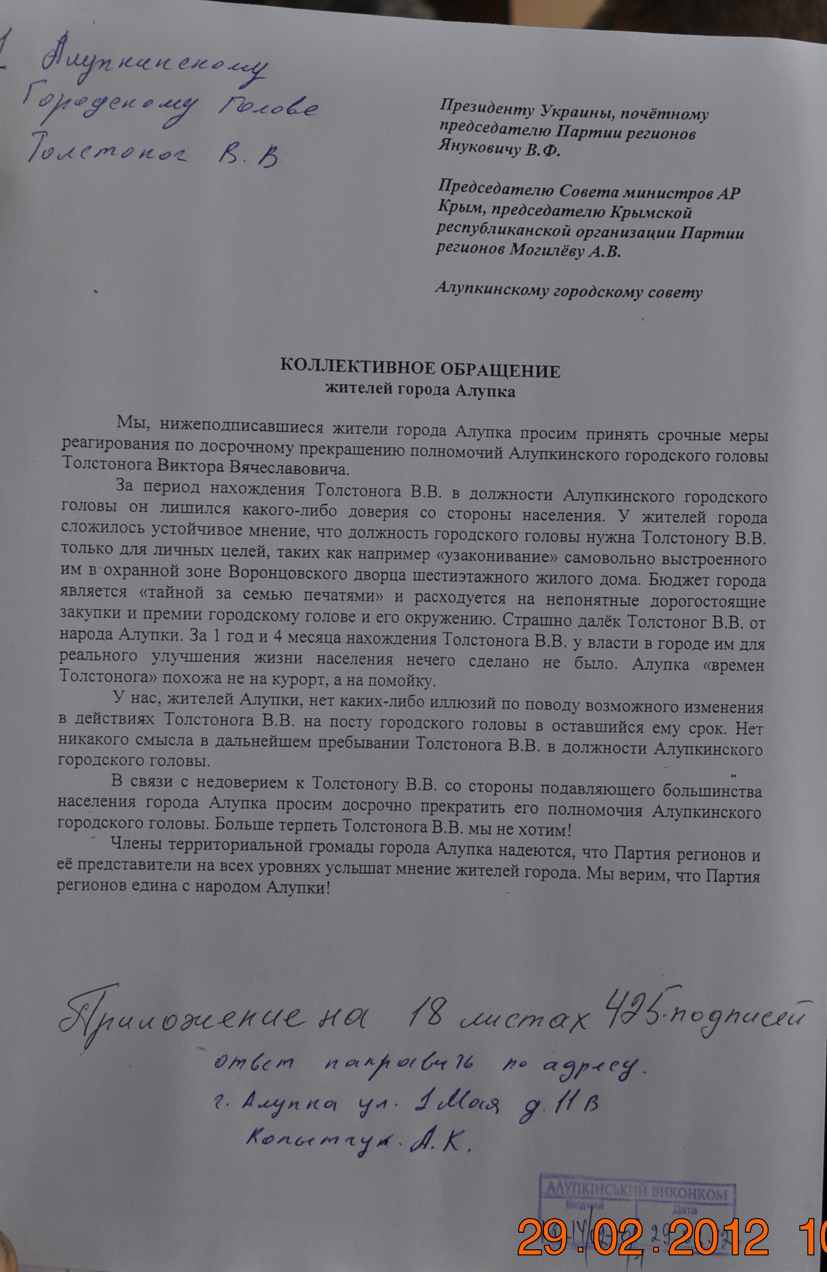 “За период нахождения Толстонога В.В. в должности Алупкинского городского головы он лишился доверия со стороны населения. Сложилось мнения, что должность головы Толстоног использует в личных целях, например, для “узаконивания” самовольно выстроенного в охранной зоне Воронцовского парка шестиэтажного жилого дома. За время правления Толстонога в городе для реального улучшения жизни населения ничего не сделано. Алупка “времен Толстонога” похожа не на курорт, а на помойку”, – говорится в обращении, текстом которого располагает “Центр”.
