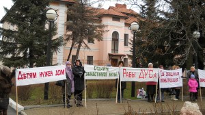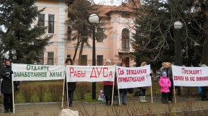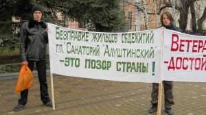 Жители общежитий, принадлежащих санаторию «Алуштинский», который находится в ведомстве Государственного управления делами при президенте Украины, заявляют о попытках незаконного их выселения. Сегодня около 20 алуштинцев приехали в Симферополь к представительству президента в Крыму и передали заявление главе государства. Они держали в руках плакаты с надписями: «Президент обрати на нас внимание», «Отдайте заработанное жилье», «Детям нужен дом».