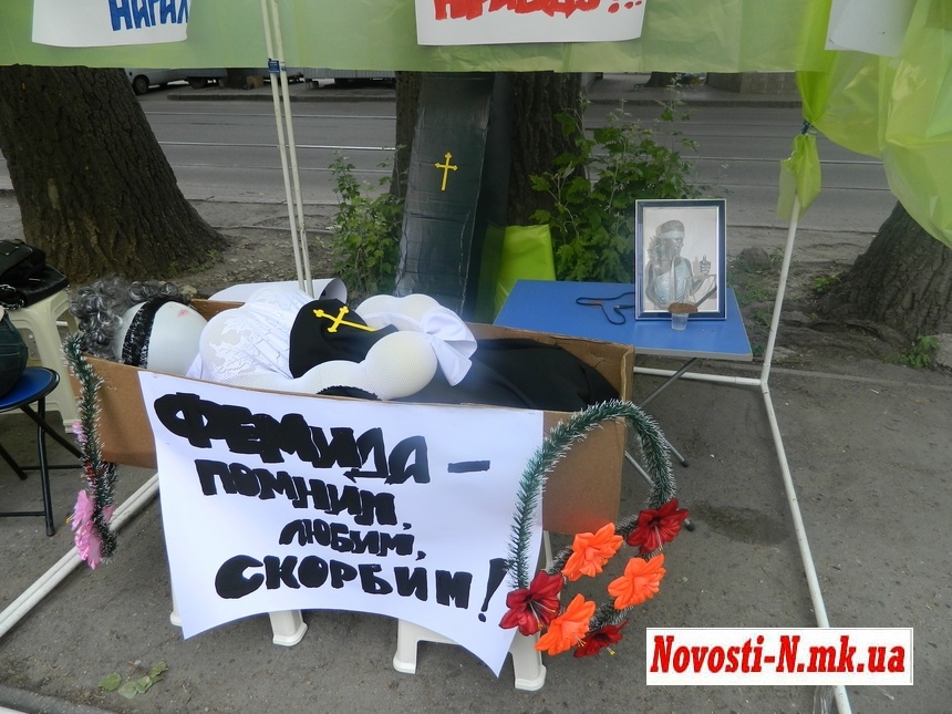 По словам организаторов акции, Фемида символизирует “дутое правосудие”. 30 мая чучело собираются «похоронить» с соблюдением всего погребального ритуала.