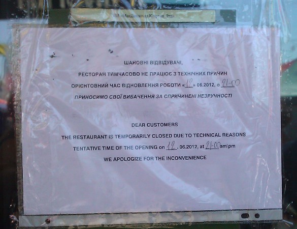 Утром на входной двери заведения появилось объявление, сообщающее о том, что по техническим причинам ресторан временно не работает – ориентировочно до 21:00 12 июня. «Приносимо свої вибачення за спричинені незручності», – указано в сообщении.