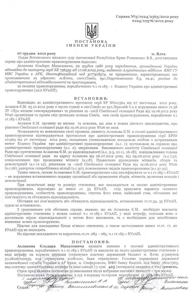«Документ о проведение сходов граждан я регистрировал заранее в поселковом совете, какой-либо письменный отказ мне не дали, — сообщил Эльдар Асланов. — Повестку в суд мне НЕ прислали, а позвонили и предупредили, что в течение часа я должен быть уже в суде, что не дало мне возможности хоть как-то подготовиться к защите».