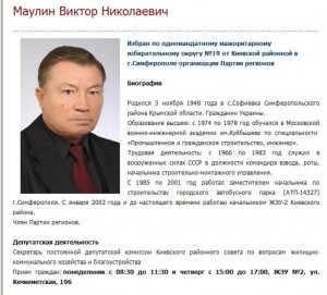 Согласно биографической справки, Маулин является членом Партии регионов и уже более 10 лет бессменно работает начальником ЖЭУ-2 Киевского района.
