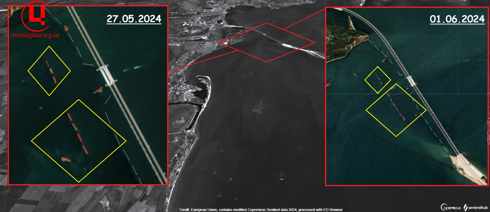 Бонові загородження мосту через Керченську протоку, облаштовані 2023 р. Джерело фото: супутник Maxar