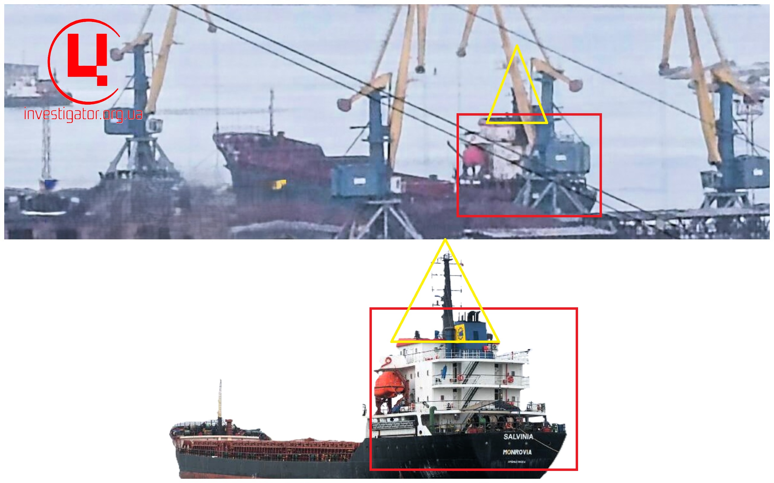 Суховантаж «Alfa M» в порту Маріуполя в січні 2025 р. та на фото сервісу Marinetraffic. Фото: https://t.me/andriyshTime, Marinetraffic. Колаж: investigator.org.ua