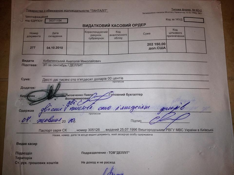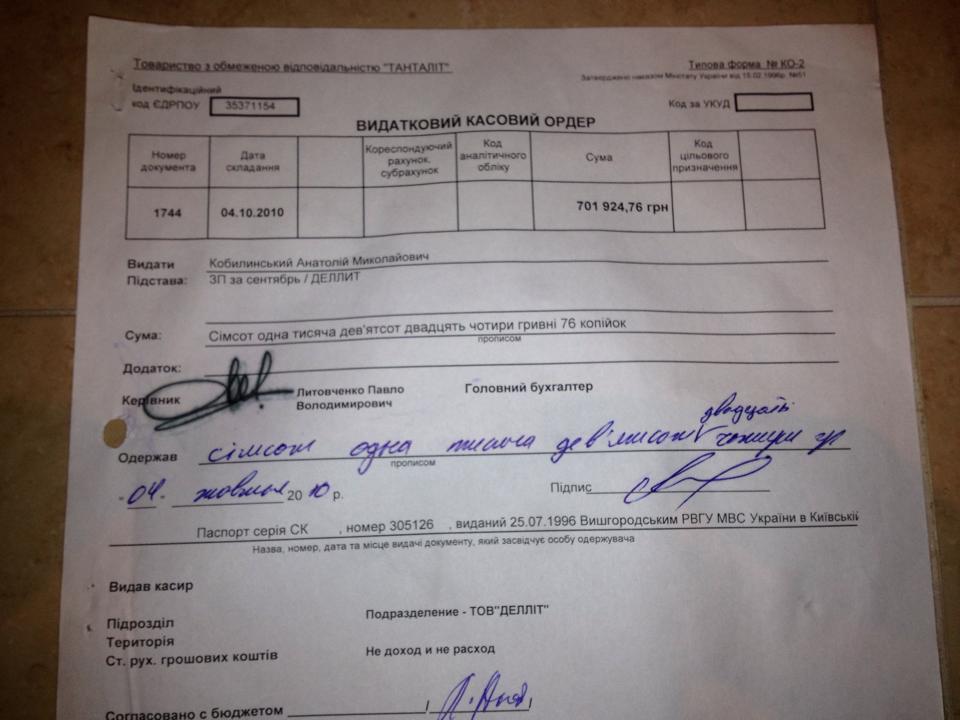 Директор общества с ограниченной ответственностью “Деллит”, которое занималось охраной Межигорья, за сентябрь 2010 года получил в качестве зарплаты наличными 919 тысяч гривен. Об этом свидетельствуют кассовые ордеры, найденные журналистами в резиденции экс-президента Украины Виктора Януковича, передает “Центр журналистских расследований”.