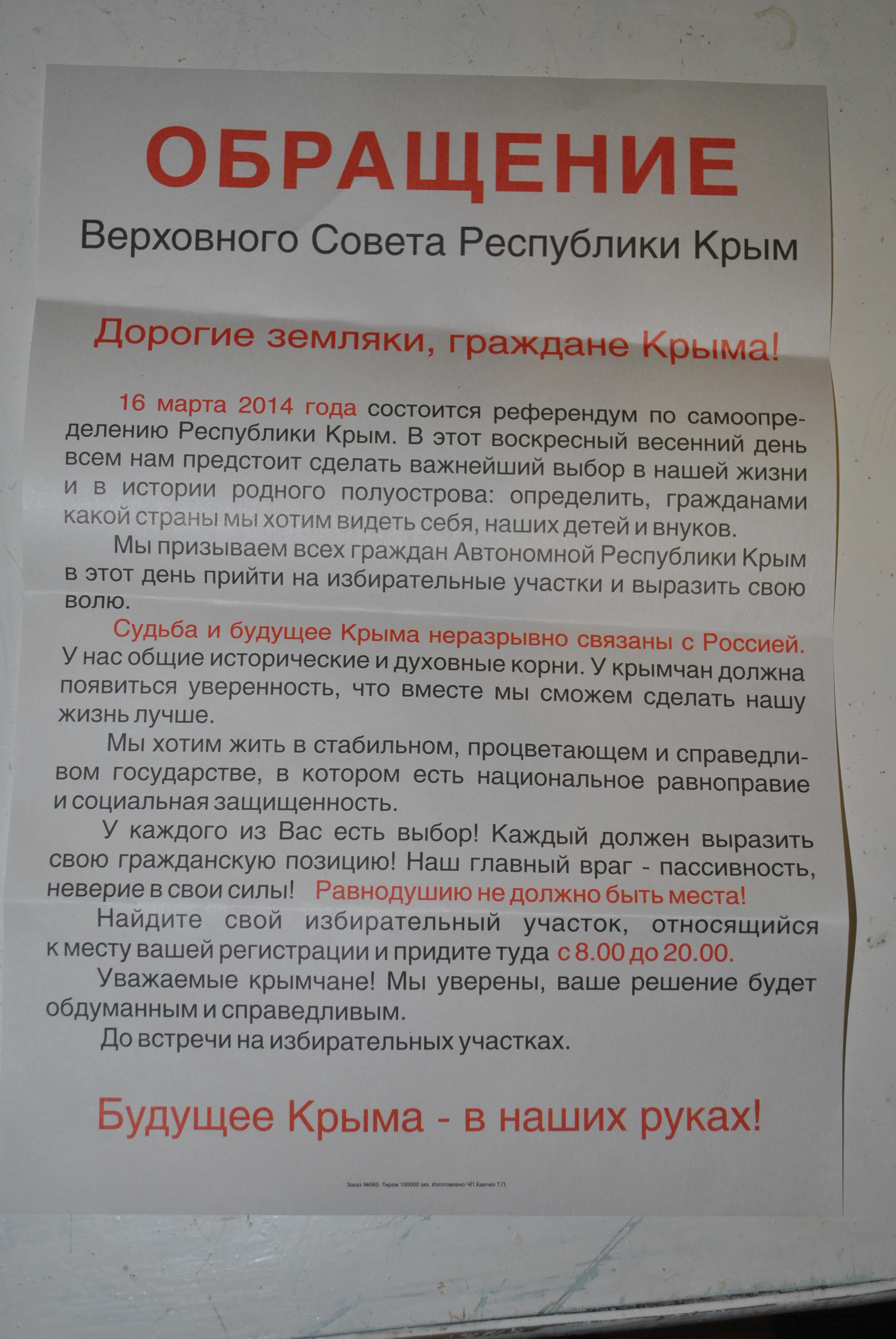 Напомним,  ВР Крыма постановила войти в состав РФ в качестве субъекта Российской Федерации, назначить на 16 марта 2014 года общекрымский референдум (включая Севастополь), на который вынести два альтернативных вопроса — о вхождении в состав РФ или о возврате Конституции-1992 и статусе Крыма как части Украины. Получивший большинство голосов вопрос будет считаться выражающим прямое волеизъявление населения Крыма. Парламент Крыма также обратился к президенту Российской Федерации и Федеральному Собранию Российской Федерации с предложением начать процедуру вхождения Крыма в состав Российской Федерации в качестве субъекта РФ.