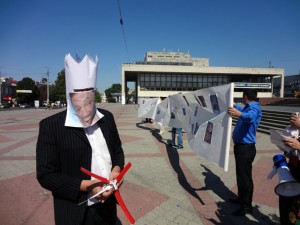 В 14-00 около десяти молодых людей вышли на площадь Ленина. Костюмы участников флешмоба символизировали бывших и нынешнего президентов Украины.