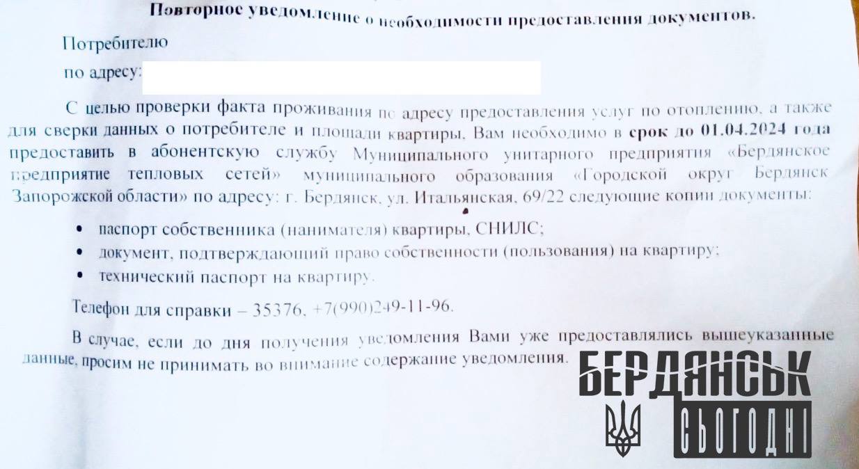 Оголошення в Бердянську. Джерело фото: https://t.me/brdVP