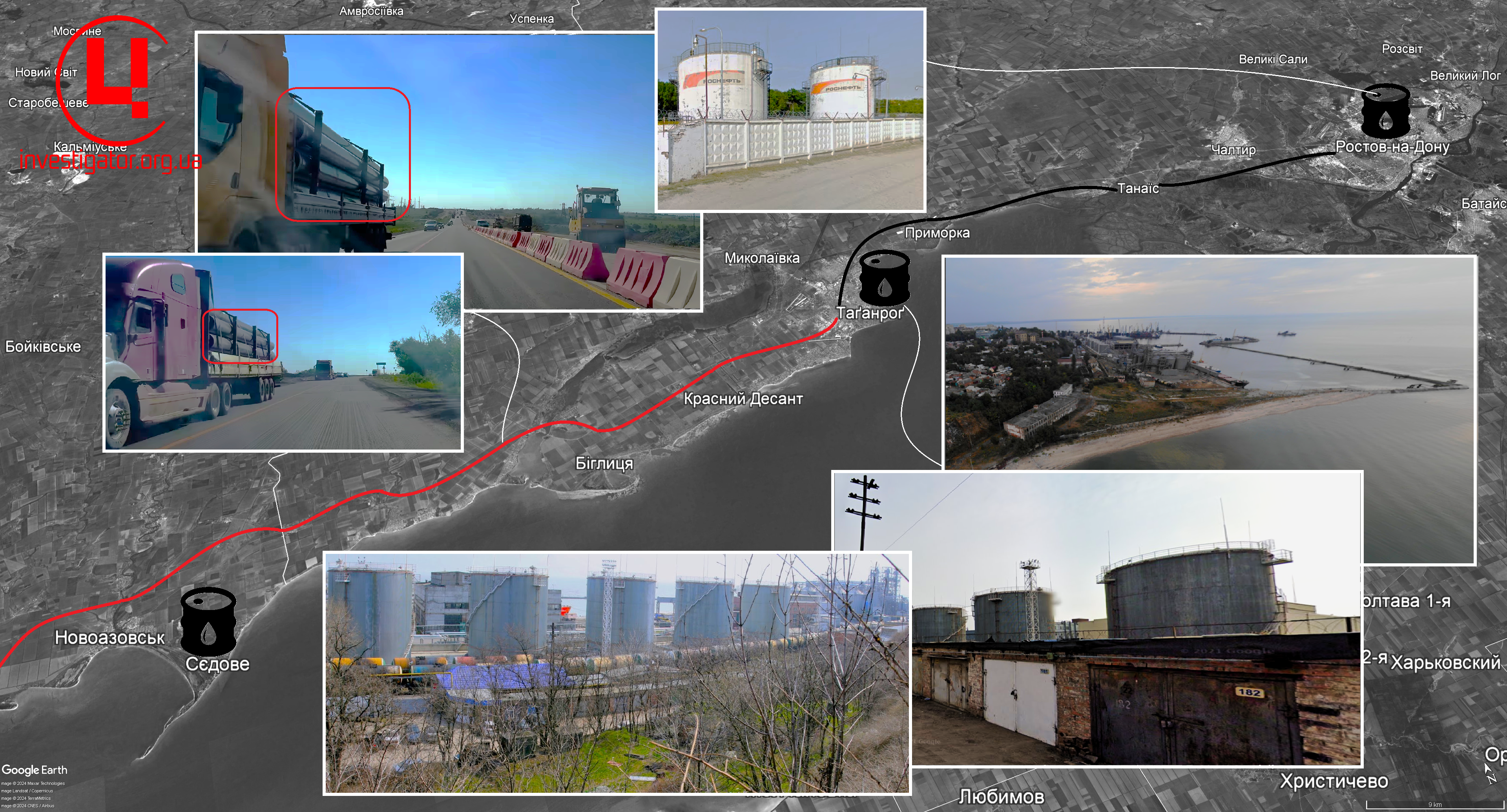 Ділянка трубопроводів від Таганрогу до Новоазовську. Літо 2024 р. Фото: соцмережі, Google Earth Колаж:investigator.org.ua