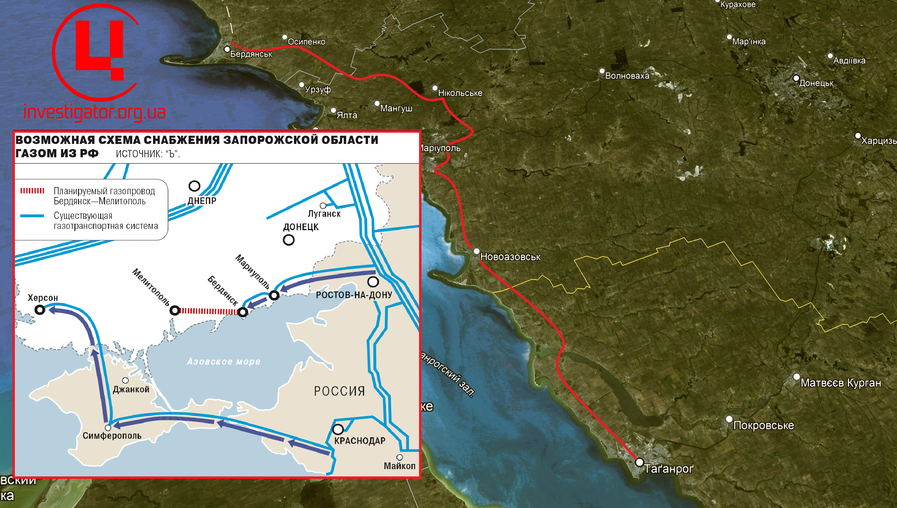 Схема газопостачання окупованого півдня та Криму з РФ. Фото: соцмережі. Колаж:investigator.org.ua