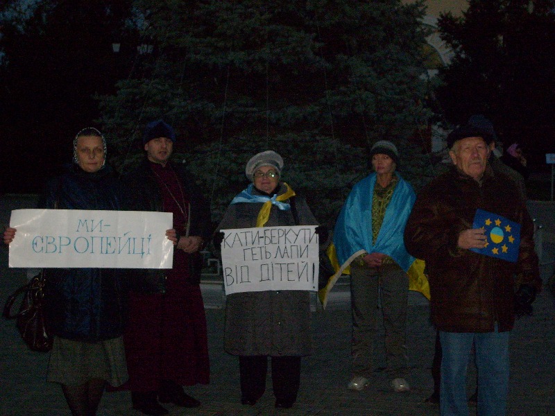 О настроениях митингующих говорили плакаты в их руках: “Кати-беркути, геть лапи від дітей!”, “На коліна – лише перед Богом”, “Ми – європейці” .