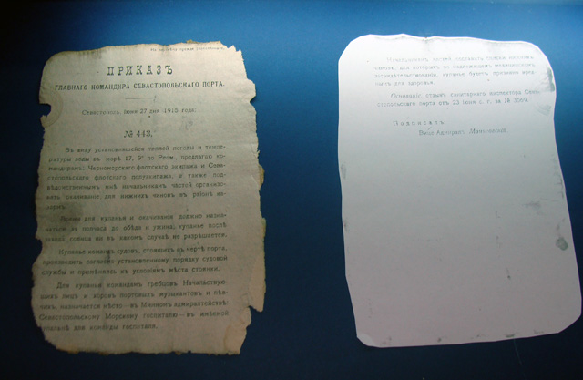 В экспозиции Музея представлены и материалы, относящиеся к Первой мировой и Великой Отечественной войнам. Среди них экспонаты, которых до настоящего времени нет ни в одном музее мира – это документы, законсервированные, отреставрированные и поднятые с затонувших боевых кораблей. Ученые сделали настоящее открытие в сфере консервации и реставрации бумаги, поскольку ранее никто не консервировал бумажные носители, которые были под водой 95 лет. В «Артеке» впервые будут выставлены документы с подписями, резолюциями, заметками, которые были написаны погибшими моряками почти век назад.
