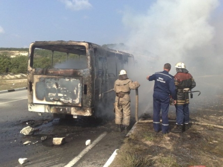 “На обратном пути в Первомайской балке, недалеко от полигона твёрдых бытовых отходов, поднимаясь в горку, водитель почувствовал запах дыма. Он остановил автобус, высадил пассажиров и открыл крышку двигателя, чтобы узнать, в чём дело. Из-под крышки вдруг вырвалось пламя. Водитель при помощи огнетушителей попытался сбить его, но безуспешно”, – сообщили спасатели.