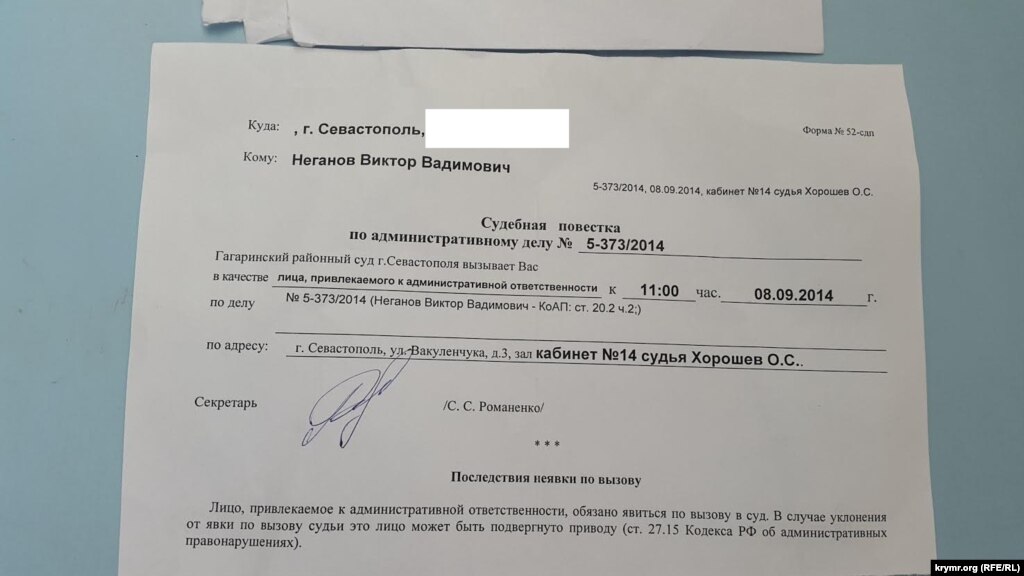 29 августа по адресу прописки Виктора Неганова– гражданского активиста из Севастополя, выступившего организатором в городе 24 августа импровизированного митинга по случаю Дня Независимости Украины – пришла повестка в суд.