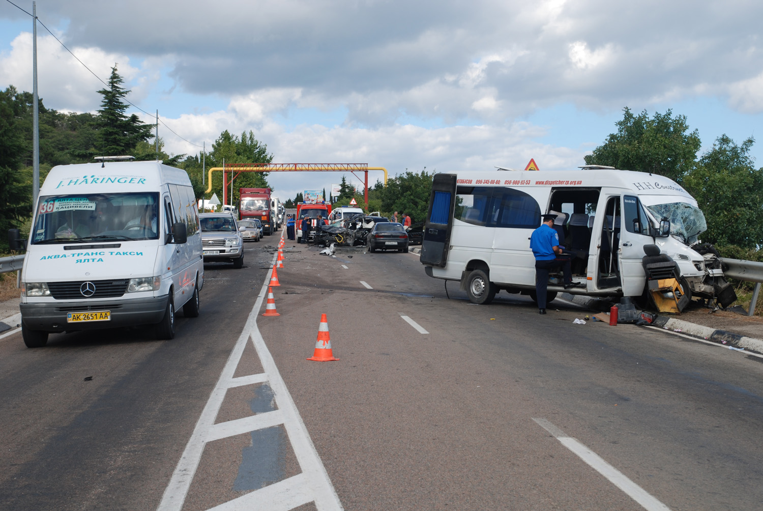 По данным ведомства, на обочине дороги стоял автомобиль с включенным сигналом аварийной остановки, его пытались объехать две легковушки «Chery-Tiggo» и следом «MITSUBISHI-GRANDIS» , (оба автомобиля Днепропетровской регистрации) которые следовали в сторону г. Ялта. В результате удара «MITSUBISHI» выехал на встречную полосу, где практически в лоб столкнулся с едущим на встречу автобусом «Мерседес-Спринтер», в котором находилось 18 человек. Автобус выполнял нерегулярные перевозки, в его салоне находились туристы отдыхающие в г. Феодосия, которые ехали по маршруту Феодосия-Ялта-Мисхор-Аквапарк «Голубой залив».