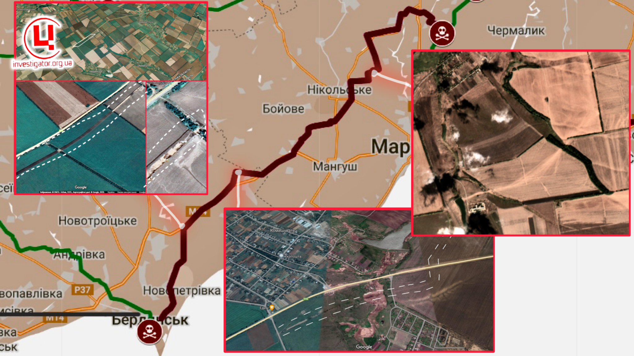 Сліди від робіт з укладання залізниці на відрізку с. Осипенко Бердянського р-ну до с.Кальчик Маріупольського р-ну, 2022 р. джерело фото: Google Maps, Колаж: investigator.org.ua