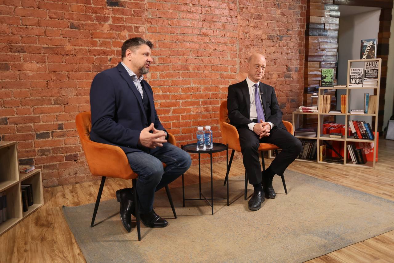 Віце-спікер Держдуми Алєксандр Бабаков (справа) та пропагандист Олег Морянін на зустрічі з іноземними “журналістами” після їхньої поїздки на ТОТ України в “Бункере на Лубянке”. 2025. Фото: mm-g.ru