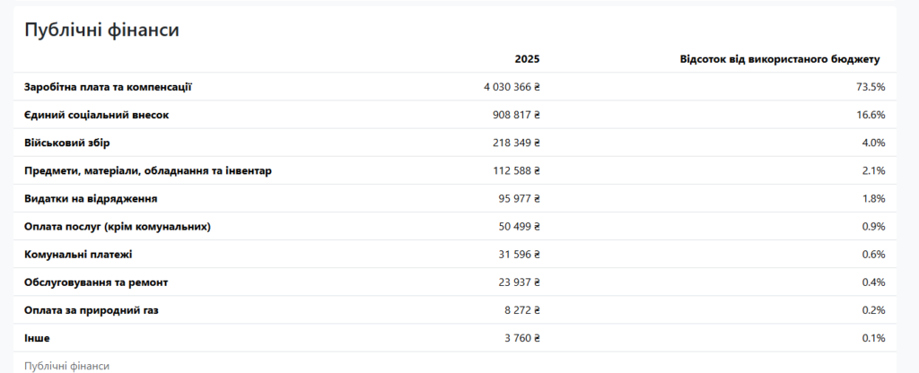 Є адміністрації, в яких левова частина коштів пішла на зарплатню їхніх голів. Наприклад, колишній правоохоронець Руслан Русаль, який з кінця 2023 року очолює військову адміністрацію невеличкої Чулаківської громади Скадовського району, отримав у 2024 році 1 313 821 гривню заробітної плати. Інформації про його доходи за поточний рік поки немає, проте якщо вони залишилися на такому ж рівні (що найімовірніше), то на зарплату Русаля пішла майже половина з 3 054 623 використаних цією адміністрацією бюджетних гривень у 2025 році .