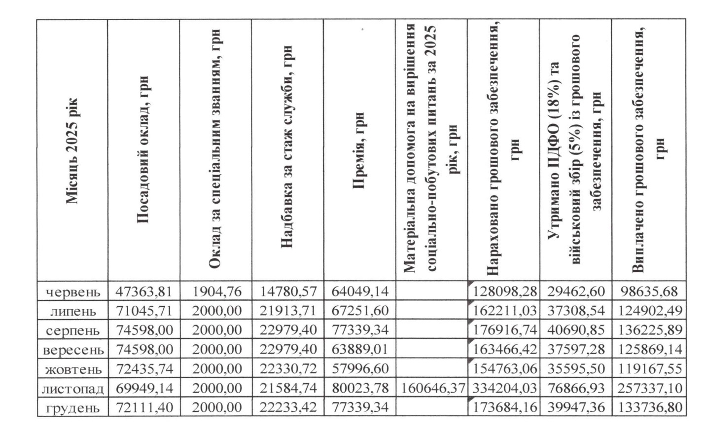 Через зміну порядку отримання грошового забезпечення у всіх них суттєво виросли зарплати. Приміром, Олексій Баткалов у 2024 році задекларував зарплату в майже 200 тисяч гривень, а протягом травня — грудня 2025 року він отримав загалом майже 530 тисяч гривень. Його колега Сергій Кухта у 2024 році задекларував грошове забезпечення в 267 тисяч гривень, а з травня по грудень 2025 року він отримав майже 873 тисячі гривень.
