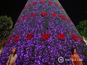 SINGAPORE – NOVEMBER 23: People pose for a photograph with a giant Christmas tree along Orchard Road on November 23, 2013 in Singapore. Attracting thousands of tourists every year, the famous shopping belt transforms with Christmas scenes and will be lighted up from 23 November 2013 to 5 January 2014. (Photo by Suhaimi Abdullah/Getty Images)