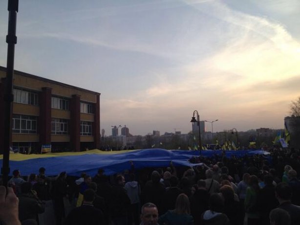Дончане стоят с флагами и другой символикой Украины, периодически люди поют гимн страны, а также скандируют “Украина единая” и “Слава шахтерам, слава Донбассу, слава Украине”.