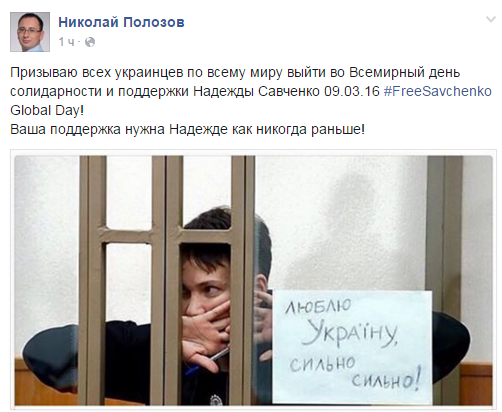 “Призываю всех украинцев по всему миру выйти во Всемирный день солидарности и поддержки Надежды Савченко 09.03.16 ‪#‎FreeSavchenko‬ Global Day! Ваша поддержка нужна Надежде как никогда раньше!”, – написал Полозов.