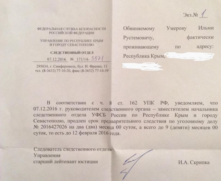 Копию полученного уведомления из ФСБ Умеров в субботу опубликовал на своей странице в Facebook, обратив внимание на то, что в документе говорится о продлении следствия до 12 февраля 2016 года, передает Центр журналистских расследований.