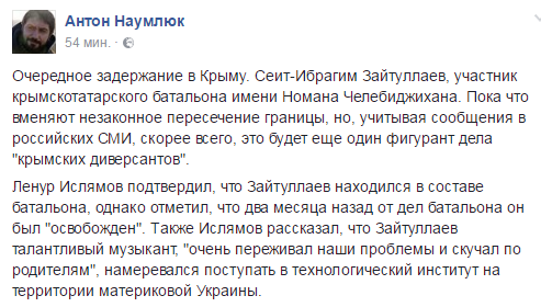 Глава общественного формирования «Аскер», координатор акции «Гражданская блокада Крыма» Ленур Ислямов подтвердил информацию о том, что российские пограничники ФСБ задержали гражданина Украины Сеит-Ибраима Зайтуллаева — бывшего члена крымскотатарского батальона имени Номана Челибиджихана — на админгранице с оккупированным Крымом.