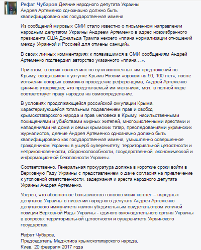 “Деяние народного депутата Украины Андрея Артеменко однозначно должно быть квалифицировано как государственная измена”, – написал Чубаров.