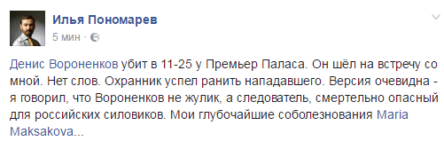 Об этом в соцсети сообщил экс-депутат Госдумы Илья Пономарев, отметив, что Вороненков шел с ним на встречу, передает Центр журналистских расследований.