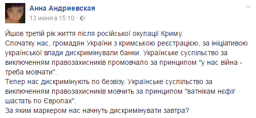 Крымская правозащитная группа выпустила заявление, в котором говорится, что слова президента о биопаспортах для крымчан «противоречат Конституции и законодательству Украины, имеют дискриминационный характер в отношении лиц, которые остались на неподконтрольных Украине территориях, вызывают напряженность в обществе».