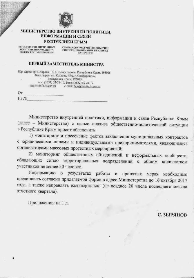 «Министерство внутренней политики информации и связи» оккупированного Крыма, с целью анализа общественно-политической ситуации в оккупированном РФ Крым просит обеспечить: