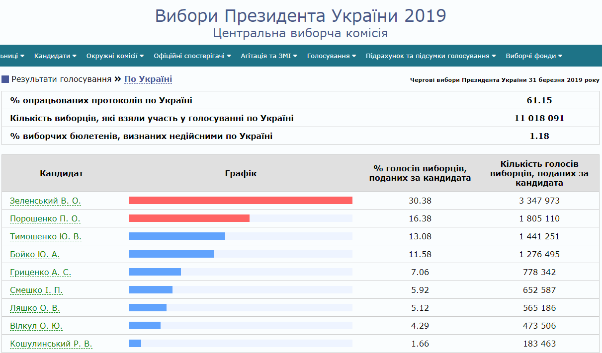 Обработано 61,15% протоколов: Зеленский – 30,38% голосов, Порошенко – 16,38%